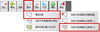 - 「建物」メニューから「建物区画」の「日影天空用建物(勾配有り)」を選びます。