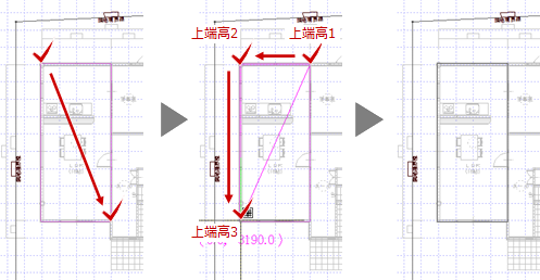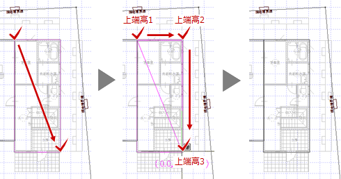 ※ 躯体面または仕上面となるように指定します。 - 「上端高1」「上端高2」「上端高3」の高さの位置を順にクリックします。
