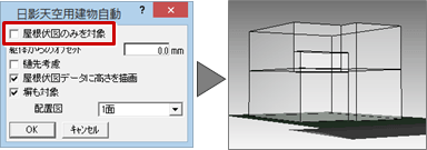 屋根伏図を作成していない場合、日影天空用建物の屋根以外の部分は、「建物」メニューから「建物区画」の「日影天空用建物(自動配置)」で「屋根伏図のみを対象」をOFFにして自動配置すると、平面図データから作成されます。