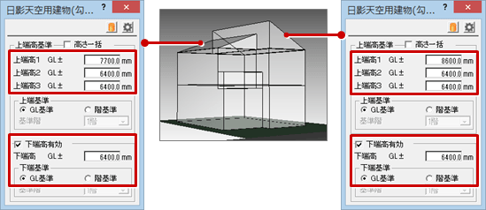次に、「建物」メニューの「建物区画」の「日影天空用建物(勾配有り)」で「下端高有効」をON、「下端高」に軒高を設定して、屋根部分だけを追加します。