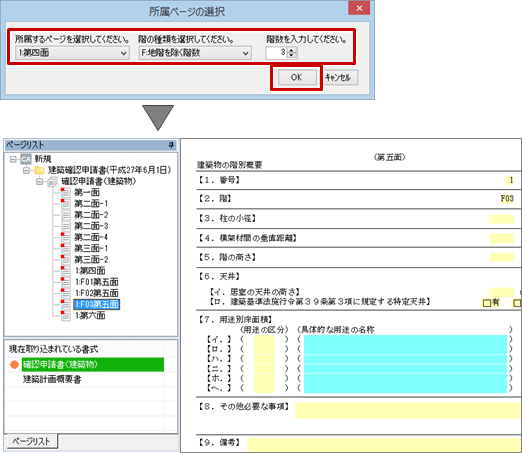 - 確認申請書(建築物)の第五面の場合は、ページの情報を設定して「OK」をクリックします。