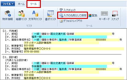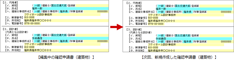 建築士などの住所や名前など決まった内容を、ひな形として保存しておくと、次回住所や名前がセットされた状態で書式を作成できます。毎回決まった内容の入力を省略できます。