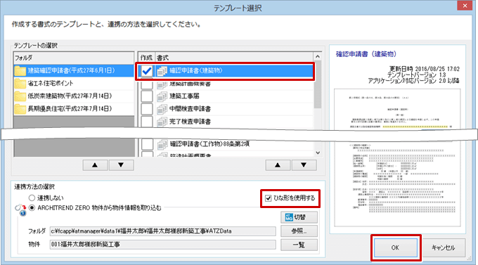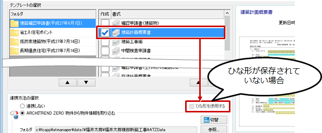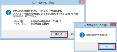 ※ ひな形は、「確認申請書(建築物)」など書式ごとに1つのみ保存できます。